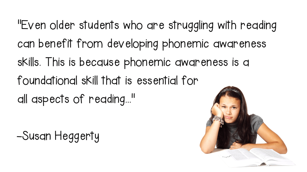 Even older students who are struggling with reading can benefit from developing phonemic awareness skills. This is because phonemic awareness is a foundational skill that is essential for all aspects of reading, including decoding, fluency, and comprehension.