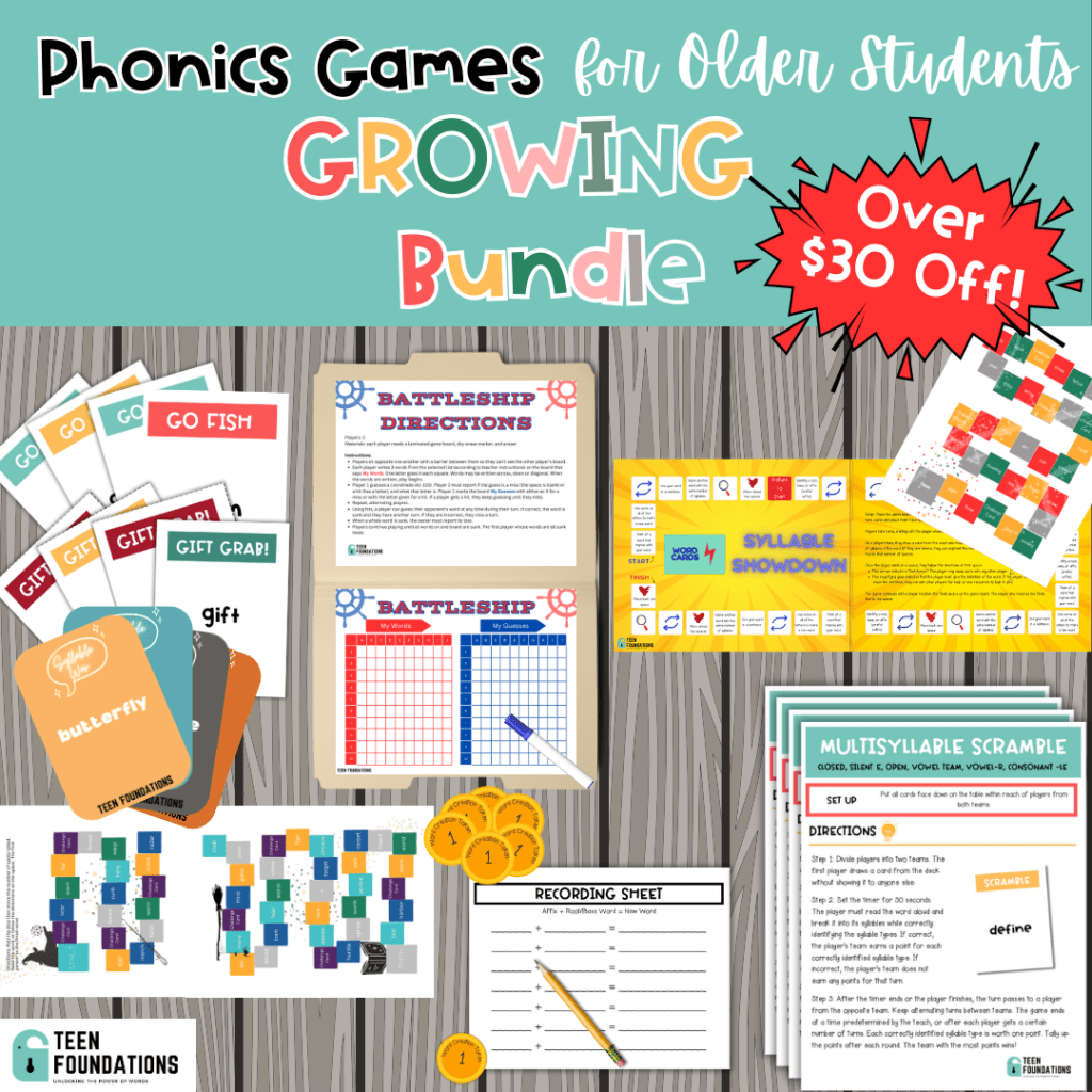 An exciting resource I’ve designed for bringing this fun element into learning phonics and morphology skills is a bundle of engaging games available on my TPT store. Tailored explicitly for upper-grade students, these games turn phonics practice into a lively, interactive, and enjoyable experience. This growing bundle, currently offering over 30 no-prep print and play games, is a treasure trove of activities that saves you time and sanity.